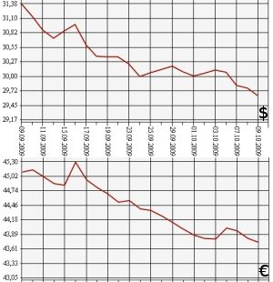 Центробанк на 9 октября 2009 года понизил курс доллара США до 29,6396 рубля, а курс евро - до 43,7510 рубля. На торгах ЕТС ММВБ средневзвешенный курс доллара с расчетами "завтра" упал до 29,6102 рубля, курс евро - до 43,7239 рубля.