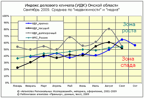 В сентябре 2009 года текущее значение ИДК в Омске неожиданно ушло вниз. Начавший рост еще в апреле (с небольшим "торможением" в июне) сводный индекс по двум секторам в августе достиг отметки 61%. Тогда эксперты прогнозировали на сентябрь дальнейший рост - до 64%, но все оказалось не так: потери относительно августа составили 9 процентных пунктов, а от прогнозируемого - 12 п.п. В итоге ИДК-текущий составил 52%.