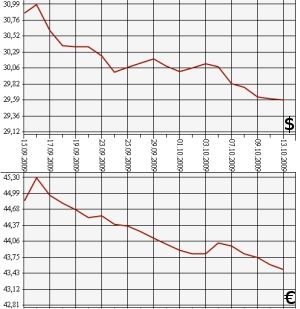 По данным ЦБ РФ, на 13 октября официальный курс доллара США к рублю понижен более чем на 1 копейку - с 29,6090 рубля до 29,5945 рубля. Официальный курс евро составил 43,5069, что на 9 копеек ниже предыдущей цены (43,6052 рубля 13 октября). Стоимость бивалютной корзины (0,45 евро и 0,55 доллара) упала более чем на 5 копеек - с 35,9073 рубля до 35,8551рубля.