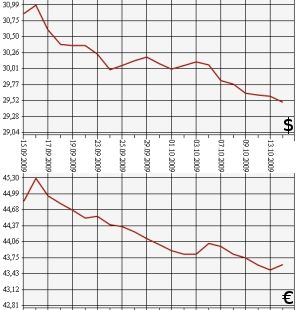 Результаты единой торговой сессии межбанковской валютной биржи показали аналогичную динамику. По итогам торгов ЕТС на ММВБ 13 октября, средневзвешенный курс доллара США с расчетами "завтра" уменьшился более чем на 3 копейки - с 29,5592 рубля до 29,5284 рубля. Средневзвешенный курс евро, напротив, увеличился - более чем на 19 копеек, с 43,5522 рубля до 43,7477 рубля.