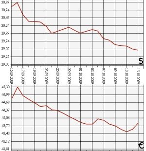 По данным ЦБ РФ, на 15 октября официальный курс доллара США к рублю понижен почти на 3 копейки - с 29,5043 рубля до 29,4651 рубля. Официальный курс евро составил 43,8647, что более чем на 25 копеек выше предыдущей цены (43,6133 рубля 14 октября). Стоимость бивалютной корзины (0,45 евро и 0,55 доллара) выросла более чем на 9 копеек - с 35,8534 рубля до 35,9449 рубля.