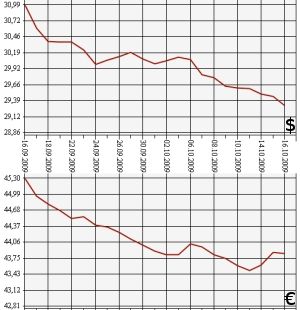 Центробанк на 16 октября понизил курс доллара США до 29,3206 рубля, а курс евро - до 43,8460 рубля. На торгах ЕТС ММВБ средневзвешенный курс доллара с расчетами "завтра" упал до 29,3447 рубля, курс евро - до 43,7898 рубля.