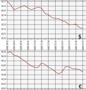 По данным ЦБ РФ, 22 октября официальный курс доллара США к рублю понижен почти на 3 копейки - с 29,1911 рубля до 29,1641 рубля. Официальный курс евро установлен на уровне 43,6003 рубля. Это более чем на 11 копеек ниже по сравнению с предыдущей ценой - 43,7166 рубля. Соответственно, бивалютная корзина (0,45 евро и 0,55 доллара) подешевела более чем на 6 копеек - с 35,7276 рубля до 35,6604 рубля.