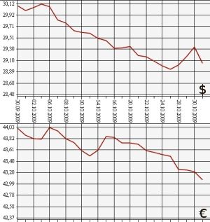 Центробанк на 31 октября 2009 года понизил курс доллара США до 29,0488 рубля, курс евро - до 43,0678 рубля. На торгах ЕТС ММВБ 29 октября средневзвешенный курс доллара с расчетами "завтра" упал до 29,0486 рубля, курс евро - до 43,0595 рубля.