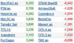Лидерами повышения в RTS Standard стали обыкновенные акции "Роснефти", подорожавшие на 2,06%, и "Газпрома" - 0,37%. Обыкновенные акции Сбербанка упали на 0,45%, обыкновенные акции ВТБ - на 0,14%. На ММВБ лучше рынка выглядели обыкновенные акции "РусГидро", подорожавшие на 2,51%. На международной бирже бумаги ВТБ упали на 0,61%, Сбербанка - на 0,36%.