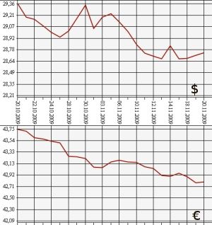 По данным ЦБ РФ, на 20 ноября официальный курс доллара США к рублю повышен почти на 3 копейки - с 28,7163 рубля до 28,7459 рубля. Курс евро также увеличен - до 42,7998 рубля. Это более чем на одну копейку выше предыдущего курса - 42,7844 рубля 19 ноября. Соответственно, выросла и стоимость бивалютной корзины (0,45 евро и 0,55 доллара) - более чем на 2 копейки, составив 35,0701 рубля.