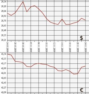 Банк России на 24 ноября понизил курс доллара США до 28,7986 рубля, а курс евро повысил до 43,0856 рубля. На торгах ЕТС ММВБ средневзвешенный курс доллара с расчетами "завтра" уменьшился до 28,7964 рубля, евро вырос до 43,1166 рубля.