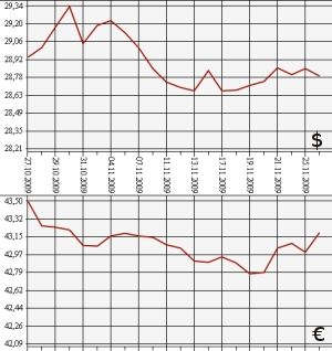 По итогам единой торговой сессии (ЕТС) межбанковской валютной биржи 25 ноября, средневзвешенный курс доллара США с расчетами "завтра" составил 28,7908 рубля. Это более чем на 4 копейки выше результата предыдущих торгов - 28,8355 рубля. Средневзвешенный курс евро с расчетами "завтра" вырос на 24 копейки с лишним - с 43,0772 рубля до 43,3211 рубля.