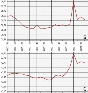 ЦБ РФ на 3 декабря 2009 года понизил курс доллара США до 29,0560 рубля, а курс евро - до 43,8252 рубля. На ММВБ средневзвешенный курс доллара с расчетами "завтра" уменьшился до 29,1339 рубля, а курс евро вырос до 43,9339 рубля.