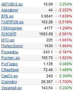 Обыкновенные акции "Газпрома" стали лидерами понижения как в RTS Standard (-2,26% - до 163,58 рубля), так и на ММВБ (-2,3% - до 163,65 рубля). Синхронно падали и акции ВТБ: в RTS - на 1,24% до 0,06427 рубля, на ММВБ - на 1,53%, до 0,0643 рубля. Обыкновенные акции Сбербанка выросли на 1,26% (RTS St.) и на 1,36% (ММВБ).