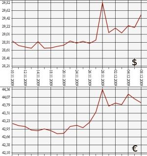 Банк России на 8 декабря 2009 года повысил курс доллара США до 29,5221 рубля, а курс евро понизил до 43,8905 рубля. На торгах ЕТС ММВБ средневзвешенный курс доллара с расчетами "завтра" вырос до 29,6880 рубля, а курс евро упал до 43,9807 рубля.