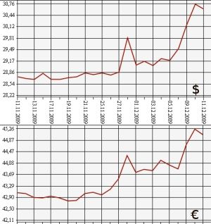 Единая торговая сессия (ЕТС) межбанковской валютной биржи 10 декабря показала аналогичную динамику. Средневзвешенный курс доллара США с расчетами "завтра" составил 30,5256 рубля, потеряв более 5 копеек относительно итога предыдущих торгов 9 декабря - 30,5785 рубля. Средневзвешенный курс евро с расчетами "завтра" упал более 12 копеек - с 45,0516 рубля до 44,9291 рубля.