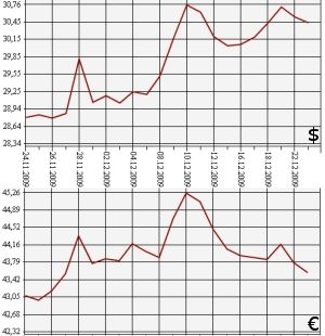 Банк России на 23 декабря 2009 года понизил курс доллара США до 30,4439 рубля, а курс евро - до 43,5744 рубля. На торгах ЕТС ММВБ средневзвешенный курс доллара с расчетами "завтра" уменьшился до 30,4862 рубля, евро - до 43,6132 рубля.