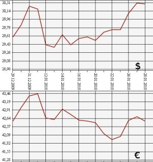 По итогам торгов на ЕТС ММВБ 27 января, средневзвешенный курс доллара США с расчетами "завтра" уменьшился на 4 копейки с лишним - с 30,3393 рубля до 30,2937 рубля. Средневзвешенный курс евро с расчетами "завтра" составил 42,5955 рубля, потеряв более 14 копеек (от 42,7402 рубля 27 января).