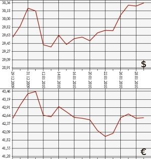 Результаты единой торговой сессии межбанковской валютной биржи показали несколько иную динамику. По итогам торгов ЕТС на ММВБ 28 января средневзвешенный курс доллара США с расчетами "завтра" вырос более чем на 5 копеек - с 30,2937 рубля до 30,3252 рубля. Курс евро, напротив, упал - более чем на 9 копеек, с 42,5955 рубля до 42,5044 рубля.