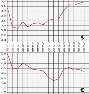 Результаты единой торговой сессии межбанковской валютной биржи показали аналогичную динамику. По итогам торгов ЕТС на ММВБ 29 января средневзвешенный курс доллара США с расчетами "завтра" вырос более чем на 5 копеек - с 30,3252 рубля до 30,3771 рубля. Курс евро уменьшился почти на 9 копеек, с 42,5044 рубля до 42,4180 рубля.