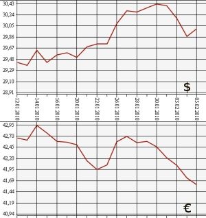 По итогам торгов на ЕТС ММВБ 4 февраля, средневзвешенный курс доллара США с расчетами "завтра" составил 30,0776 рубля, прибавив более 19 копеек по сравнению с результатом предыдущих торгов 3 февраля - 29,8861 рубля. Средневзвешенный курс евро с расчетами "завтра" упал почти на 16 копеек - с 41,8247 рубля до 41,6651 рубля.