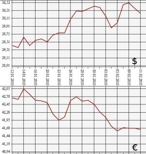 Центробанк на 11 февраля 2010 года понизил курс евро к рублю до 41,6551 рубля, а курс доллара США - до 30,2462 рубля. На торгах ЕТС ММВБ средневзвешенный курс евро с расчетами "завтра" упал до 41,6533 рубля, курс доллара - до 30,2407 рубля.