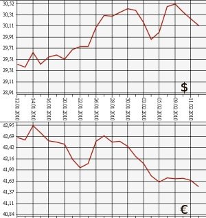 Результаты единой торговой сессии межбанковской валютной биржи показали аналогичную динамику. По итогам торгов ЕТС на ММВБ 11 февраля, средневзвешенный курс доллара США с расчетами "завтра" уменьшился более чем на 10 копеек - с 30,2407 рубля до 30,1344 рубля. Средневзвешенный курс евро также упал - более чем на 23 копейки, с 41,6533 рубля до 41,4209 рубля.