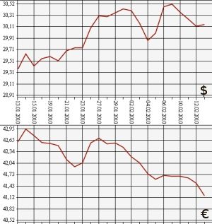 По итогам торгов единой торговой сессии (ЕТС) на ММВБ 12 февраля, средневзвешенный курс доллара США с расчетами "завтра" составил 30,2555 рубля. Это на 12 копеек с небольшим выше результата предыдущих торгов - 30,1344 рубля 11 февраля. Средневзвешенный курс евро упал почти на 30 копеек - с 41,4209 рубля до 41,1227 рубля.