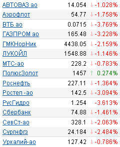 Как сообщает "Финам", серьезные потери понесли акции нефтегазовых компаний и банков - "Сургутнефтегаз" (-2,48%), "Газпром" (-3,23%), "Лукойл" (-1,15%), ВТБ (-3,77%), Сбербанк (–1,46%). Продолжилось падение бумаг электроэнергетических компаний, на котировки которых повлияла критика российского правительства.