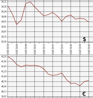 Банк России на 1 марта 2010 года понизил курс доллара до 29,9484 рубля, а курс евро повысил до 40,8047 рубля. Средневзвешенный курс доллара с расчетами "завтра" на торгах ЕТС ММВБ уменьшился до 29,9479 рубля, евро вырос до 40,8268 рубля.ЦБ РФ на 1 марта установил официальный курс доллара США на уровне 29,9484 рубля. Это на 9 с небольшим копеек ниже курса 28 февраля - 30,0388 рубля. Официальный курс евро к рублю, напротив, повышен - почти на 5 копеек, с 40,7566 рубля до 40,8047 рубля.