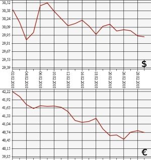 Центробанк на 2 марта 2010 года понизил курс евро до 40,7377 рубля, курс доллара США - до 29,9300 рубля. Средневзвешенный курс евро с расчетами "завтра" на торгах ЕТС ММВБ упал до 40,6610 рубля, курс доллара - до 29,9216 рубля.По данным Банка России, на 2 марта официальный курс доллара США к рублю понижен более чем на 1 копейку - с 29,9484 рубля до 29,9300 рубля. Официальный курс евро к рублю подешевел более чем на 6 копеек (против 40,8047 рубля 1 марта) и составил 40,7377 рубля.