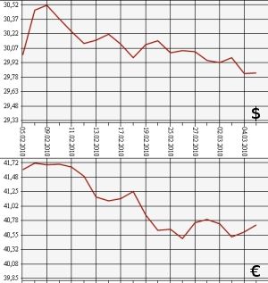 Банк России на 5 марта 2010 года повысил курс доллара США до 29,8217 рубля, курс евро - до 40,7215 рубля. На торгах ЕТС ММВБ средневзвешенный курс доллара с расчетами "завтра" упал до 29,8016 рубля, а курс евро вырос - до 40,7310 рубля.Центробанк РФ на 5 марта установил официальный курс доллара США к рублю на уровне 29,8217 рубля. Это менее чем на копейку выше предыдущего - 29,8140 рубля 4 марта. Официальный курс евро также повышен - более чем на 12 копеек, с 40,6007 рубля до 40,7215 рубля.