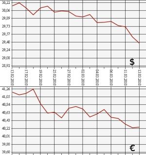 Банк России на 13 марта 2010 года повысил курс евро до 40,2610 рубля, а курс доллара США понизил до 29,3897 рубля. На торгах ЕТС ММВБ средневзвешенный курс евро с расчетами "завтра" вырос до 40,3164 рубля, а курс доллара уменьшился до 29,3411 рубля.По данным ЦБ РФ, на 13 марта официальный курс доллара США к рублю понижен почти на 13 копеек - с 29,5195 до 29,3897 рубля. Одновременно официальный курс евро был повышен - более чем на одну копейку (против 40,2469 рубля 12 марта) и составил 40,2610 рубля.