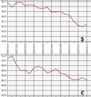 Банк России на 17 марта 2010 года повысил курс доллара США до 29,4242 рубля, а курс евро понизил - до 40,2347 рубля. На торгах ЕТС ММВБ средневзвешенный курс доллара с расчетами "завтра" составил 29,3954 рубля, а курс евро - 40,2474 рубля.По информации Центробанка, на 17 марта официальный курс доллара США к рублю повышен почти на 9 копеек - с 29,3353 до 29,4242 рубля. Официальный курс евро составил 40,2347 рубля. Это более чем на 9 копеек ниже уровня 16 марта - 40,3272 рубля.