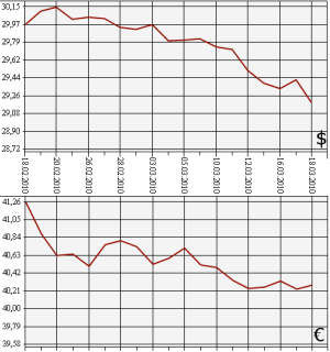На 18 марта ЦБ РФ понизил официальный курс доллара до 29,1927 рубля, повысив евро до 40,2830 рубля. На торгах ЕТС ММВБ средневзвешенный курс доллара с расчетами "завтра" опустился до 29,1752 рубля, курс евро с расчетами "завтра" - до 40,1723 рубля.