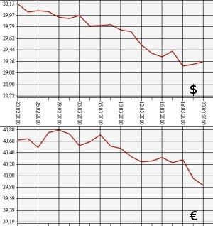 Результаты единой торговой сессии межбанковской валютной биржи показали аналогичную динамику. По итогам торгов ЕТС на ММВБ 19 марта, средневзвешенный курс доллара США с расчетами "завтра" составил 29,2721 рубля, подорожав на 5 копеек с небольшим по сравнению с результатом торгов 18 марта - 29,2223 рубля. Средневзвешенный курс евро с расчетами "завтра" упал более чем на 24 копейки - с 39,9657 рубля до 39,7241 рубля.