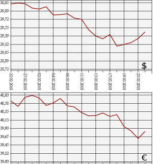 Единая торговая сессия валютной биржи показала иную динамику. По итогам торгов на ЕТС ММВБ 23 марта, средневзвешенный курс доллара США с расчетами "завтра" повысился более чем на 1 копейку - с 29,4660 рубля на предыдущих торгах до 29,4800 рубля. А вот средневзвешенный курс евро с расчетами "завтра", напротив, понизился - более чем на 3 копейки, с 39,8621 рубля до 39.8233 рубля.