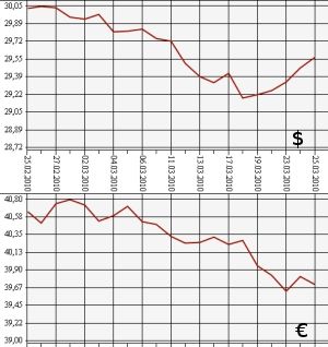 Единая торговая сессия валютной биржи показала аналогичную динамику. По итогам торгов на ЕТС ММВБ 24 марта, средневзвешенный курс доллара США с расчетами "завтра" вырос почти на 14 копеек - с 29,4800 рубля по итогам предыдущих торгов до 29,6278 рубля. Средневзвешенный курс евро с расчетами "завтра" составил 39,6424 рубля, потеряв 18 копеек с небольшим относительно результата торгов 23 марта - 39,8233 рубля.