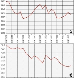 Банк России на 10 апреля понизил курс доллара США до 29,3232 рубля, курс евро повысил до 39,2286 рубля. На торгах ЕТС ММВБ средневзвешенный курс доллара с расчетами "завтра" упал до 29,2905 рубля, курс евро вырос до 39,2292 рубля.