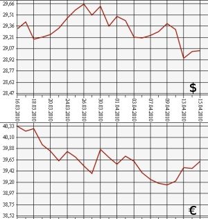 Центробанк на 15 апреля повысил курс евро к рублю до 39,6253 рубля, курс доллара США - до 29,0444 рубля. На торгах ЕТС ММВБ средневзвешенный курс евро с расчетами "завтра" вырос до 39,5489 рубля, курс доллара уменьшился до 29,0166 рубля.Банк России на 15 апреля 2010 года установил официальный курс доллара США к рублю на уровне 29,0444, что на полторы копейки выше предыдущего - 29,0294 рубля 14 апреля. Официальный курс евро также повышен - более чем на 14 копеек, с 39,4829 рубля до 39,6253 рубля.
