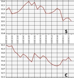 По информации ЦБ РФ, на 16 апреля 2010 года официальный курс доллара США к рублю понижен более чем на 11 копеек - с 29,0444 до 28,9310 рубля. Официальный курс евро составил 39,4387 рубля, подешевев на 18 с лишним копеек по сравнению с предыдущим уровнем - 39,6253 рубля 15 апреля.