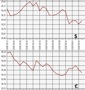 По данным Центробанка, на 17 апреля 2010 года официальный курс доллара США к рублю повышен более чем на 10 копеек - с 28,9310 до 29,0325 рубля. Официальный курс евро, напротив, понижен - более чем на 16 копеек, с 39,4387 рубля до 39,2723 рубля.