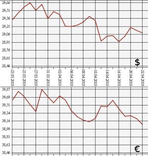 Банк России на 22 апреля понизил курс доллара США до 29,0906 рубля, а курс евро - до 39,0919 рубля. На торгах ЕТС ММВБ средневзвешенный курс доллара с расчетами "завтра" упал до 29,1053 рубля, курс евро - до 39,0450 рубля.Центробанк на 22 апреля 2010 года установил официальный курс доллара США к рублю на уровне 29,0906 рубля. Это почти на 5 копеек ниже предыдущего - 29,1381 рубля 21 апреля. Официальный курс евро к рублю понижен почти на 13 копеек - с 39,2199 рубля до 39,0919 рубля.