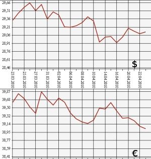 По данным ЦБ РФ, на 23 апреля 2010 года официальный курс доллара США к рублю повышен более чем на 3 копейки - с 29,0906 рубля до 29,1288 рубля. Официальный курс евро, напротив, опустился на 5 копеек с небольшим (от 39,0919 рубля 22 апреля) и составил 39,0413 рубля.
