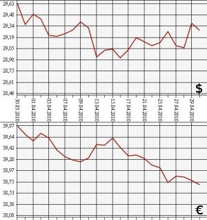 ЦБ РФ на 30 апреля 2010 года установил официальный курс доллара США к рублю на отметке 29,2886 рубля, понизив на 9 с лишним копеек по отношению к предыдущему курсу - 29,3801 рубля. Официальный курс евро также опустился - почти на 8 копеек, с 38,7817 рубля до 38,7020 рубля.