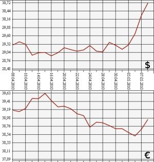 Результаты единой торговой сессии межбанковской валютной биржи показали аналогичную динамику. По итогам торгов ЕТС на ММВБ 7 мая средневзвешенный курс доллара США с расчетами "завтра" вырос более чем на 32 копейки - с 30,2863 рубля до 30,5913 рубля. Евро подорожал почти на 31 копейку (по сравнению с результатом предыдущих торгов 6 мая - 38,6522 рубля) и составил 38,9590 рубля.