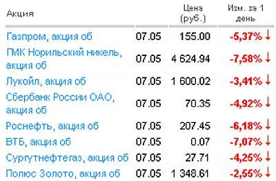 Индекс ММВБ обновил полугодовой минимум, упав по итогам дня на 5,61% - до 1288,61 пункта. К концу торгов он пробил вниз психологическую отметку 1300 пунктов. Индекс РТС потерял 5,55%, составив 1369,91 пункта, обновил пятимесячный минимум. В пятницу индекс РТС ушел ниже 1400 пунктов. Первую торговую неделю мая уже назвали "черной" и провальной: за четыре дня индекс РТС упал на 12,9%, индекс ММВБ - на 10,3%.
