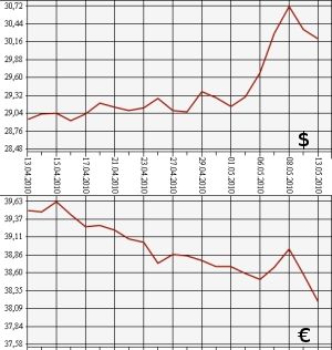 Результаты единой торговой сессии межбанковской валютной биржи показали аналогичную динамику. По итогам торгов ЕТС на ММВБ 12 мая, средневзвешенный курс доллара США с расчетами "завтра" уменьшился более чем на 23 копейки - с 30,2874 рубля до 30,0509 рубля. Средневзвешенный курс евро составил 38,0866 рубля, опустившись более чем на 35 копеек по сравнению с результатом предыдущих торгов - 38,4384 рубля 11 мая.