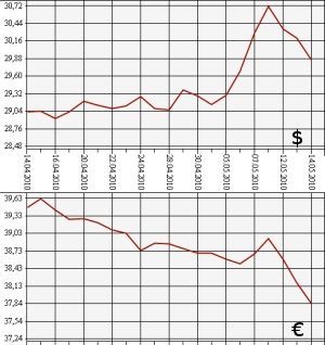 Результаты единой торговой сессии межбанковской валютной биржи показали аналогичную динамику. По итогам торгов ЕТС на ММВБ 13 мая, средневзвешенный курс доллара США с расчетами "завтра" составил 29,9181 рубля, что на 13 копеек с небольшим ниже предыдущего (30,0509 рубля). Средневзвешенный курс евро также упал - почти на 30 копеек, с 38,0866 рубля до 37,7888 рубля.