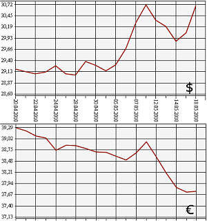 На 18 мая Банк России повысил официальный курс евро к рублю более чем на 2 копейки - с 37,7282 рубля до 37,7562 рубля. Курс доллара США повышен более ощутимо - сразу на 64 копейки, с 30,0575 рубля до 30,6986 рубля.