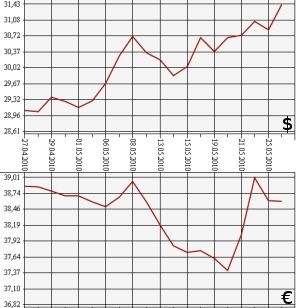 Банк России на 26 мая 2010 года повысил курс доллара США до 31,4293 рубля, курс евро понизил до 38,6046 рубля. На торгах ЕТС ММВБ средневзвешенный курс доллара с расчетами "завтра" вырос до 31,5148 рубля, курс евро упал до 38,5551 рубля.