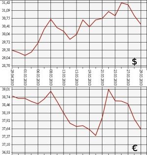 Банк России на 29 мая 2010 года понизил курс евро до 37,6316 рубля, а курс доллара США - до 30,4956 рубля. На торгах ЕТС ММВБ средневзвешенный курс евро с расчетами "завтра" упал до 37,7700 рубля, курс доллара - до 30,5146 рубля.