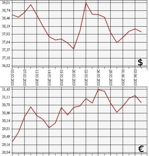Банк России на 4 июня 2010 года понизил курс доллара США до 30,8938 рубля, а курс евро - до 38,0117 рубля. На торгах ЕТС ММВБ средневзвешенный курс доллара с расчетами "завтра" опустился до 30,9612 рубля, евро - до 38,0255 рубля.