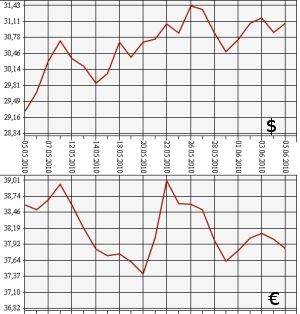 Центробанк на 5 июня 2010 года повысил курс доллара США до 31,0685 рубля, а курс евро - понизил до 37,8476 рубля. На торгах ЕТС ММВБ средневзвешенный курс доллара с расчетами "завтра" вырос до 31,1640 рубля, евро упал - до 37,8427 рубля.По информации ЦБ РФ, на 5 июня официальный курс доллара США к рублю повышен более чем на 17 копеек - с 30,8938 до 31,0685 рубля. Официальный курс евро одновременно почти на столько же понижен - более чем на 16 копеек, с 38,0117 рубля до 37,8476 рубля.